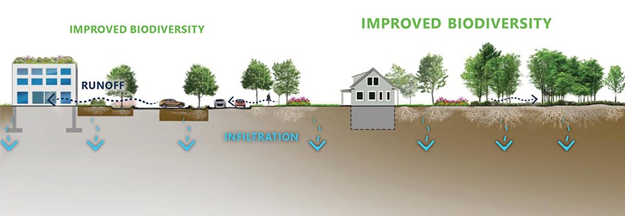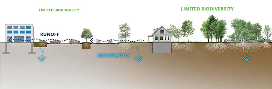 But effectively achieving a sustainable urban ecosystem balance is challenging. For example, not all green spaces help achieve a healthy urban ecosystem. While lawns are green, common construction methods result in excessive compaction and destruction of soil health, reducing the lawn’s ability to absorb stormwater.