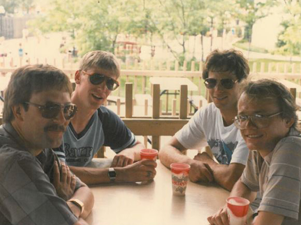 2. Barr engineers Greg Keil, Bill Forsmark, Jim Herbert, and Tim Anderson (left to right) enjoy a picnic lunch at Valleyfair circa 1990. All four are still at Barr today.