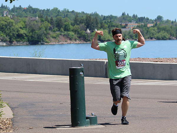 John powers through the July heat in an annual community 5K run for charity in Duluth, Minnesota.