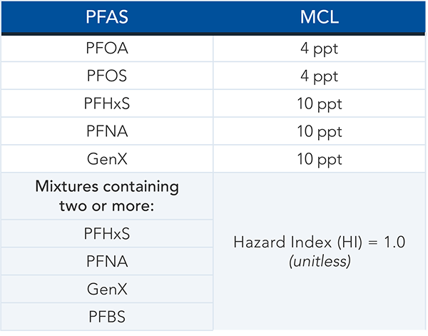 Today, the U.S. Environmental Protection Agency (EPA) announced the much-anticipated National Primary Drinking Water Regulation (NPDWR) for six per- and polyfluoroalkyl substances (PFAS) under the Safe Drinking Water Act (SDWA). The regulation, like NPDWR for other chemicals, includes enforceable maximum contaminant levels (MCLs), as shown below. The new federal MCLs are considered the maximum allowable concentrations in parts per trillion (ppt) of select PFAS in public drinking water systems.