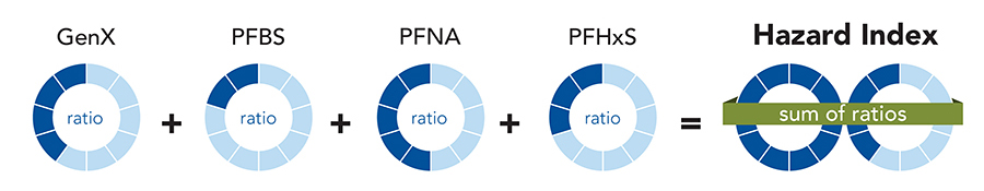 Individual MCLs are set for five different PFAS, but an approach known as a Hazard Index (HI) applies to three of these individual PFAS and includes a fourth PFAS called PFBS, which doesn’t have a stand-alone MCL. The HI approach treats these PFAS as a mixture using an additive approach (see graphic below). The HI approach is commonly used for Superfund cleanups, but this is the first time it’s being applied to MCLs. Some current MCLs for other compounds consider the total summed concentrations of multiple contaminants (e.g., polychlorinated biphenyls, or PCBs); however, none use the “sum of ratios” additive approach of an HI.