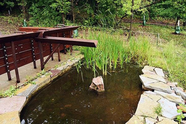 Stormwater runoff is collected from the nature center’s roof, patios, and sidewalks and is stored underground. The runoff is then pumped to the surface via hand pumps or a solar pump and discharged into a trough. The water flows from the trough into basins and channels, crossing sidewalks in trench drains until it reenters the underground storage. The water recirculates through the system until it infiltrates, evaporates, or is used through evapotranspiration.