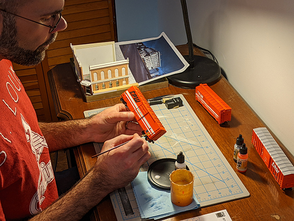 Adam puts the finishing touches on a model boxcar. Model railroading has been a favorite hobby of Adam’s since childhood. His model railroad is based on the Toledo, Peoria & Western railroad near where he grew up in Illinois.
