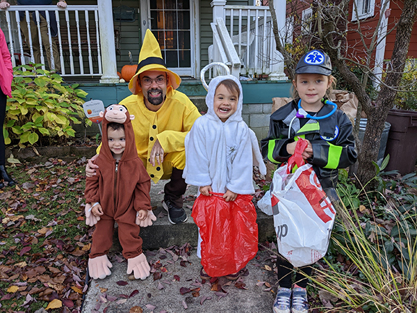Adam gets ready to trick-or-treat with his “daughter fleet.”