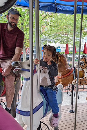 Adam testing out different carousel animals on his middle daughter’s birthday.