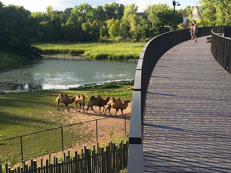 The result is a 1.25-mile trail—the world’s longest elevated pedestrian loop, according to zoo staff—within the canopies of the site’s many trees. Walking along at their own pace and stopping at the route’s many bumpout overlooks, visitors have many opportunities to see tigers, moose, bison, camels, and more while simply enjoying the natural beauty of the zoo at 30 feet off the ground.