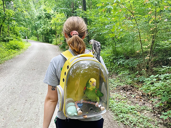 Becca walks her parrots on the MKT Nature and Fitness Trail in Columbia, Missouri.