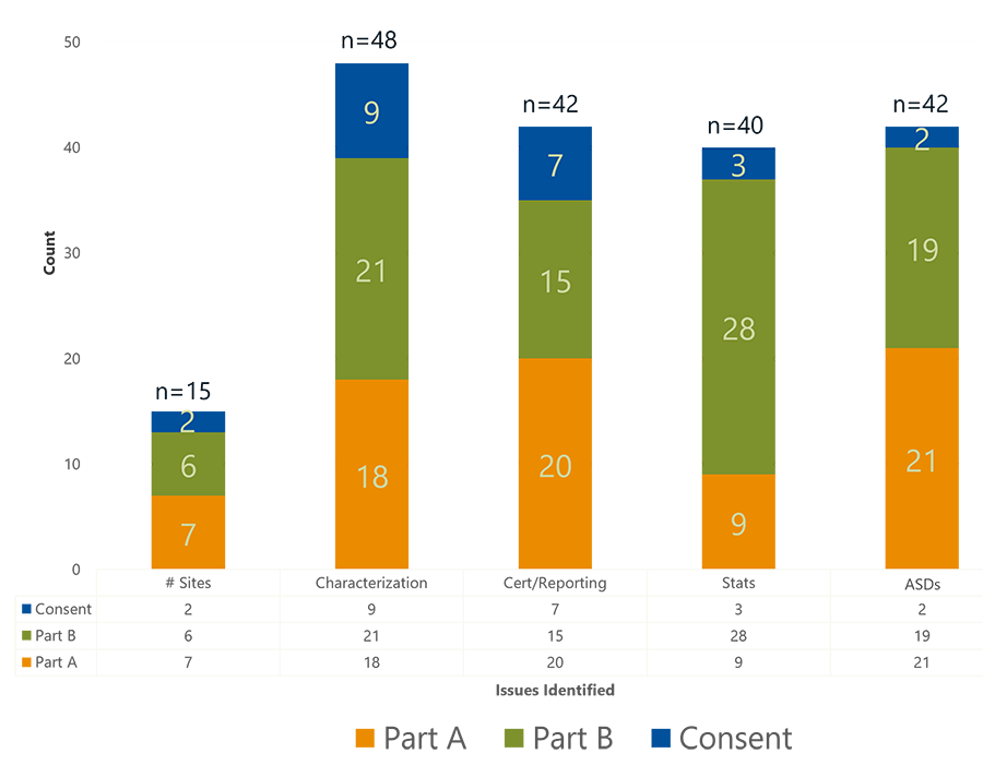 Site characterization and monitoring network issues were cited 48 times by the EPA at one or more of the 15 total sites included in this study. These include 7 Part A, 6 Part B, and 2 consent decree mentions. Specific issues cited by the EPA under this category include: