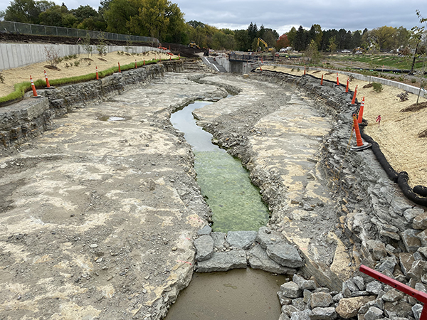 Completed in 2021, the stormwater management system includes dry filtration basins planted with native plants and open-water features, including a nearly half-mile-long recreational pond. By daylighting Hidden Falls Creek, buried in a pipe almost 100 years ago, the project reduces intense water flows to the falls itself by 98% in a two-year event, helping to restore the falls and creek. The system also reduces total suspended solids by more than 90% and phosphorus by over 70%.